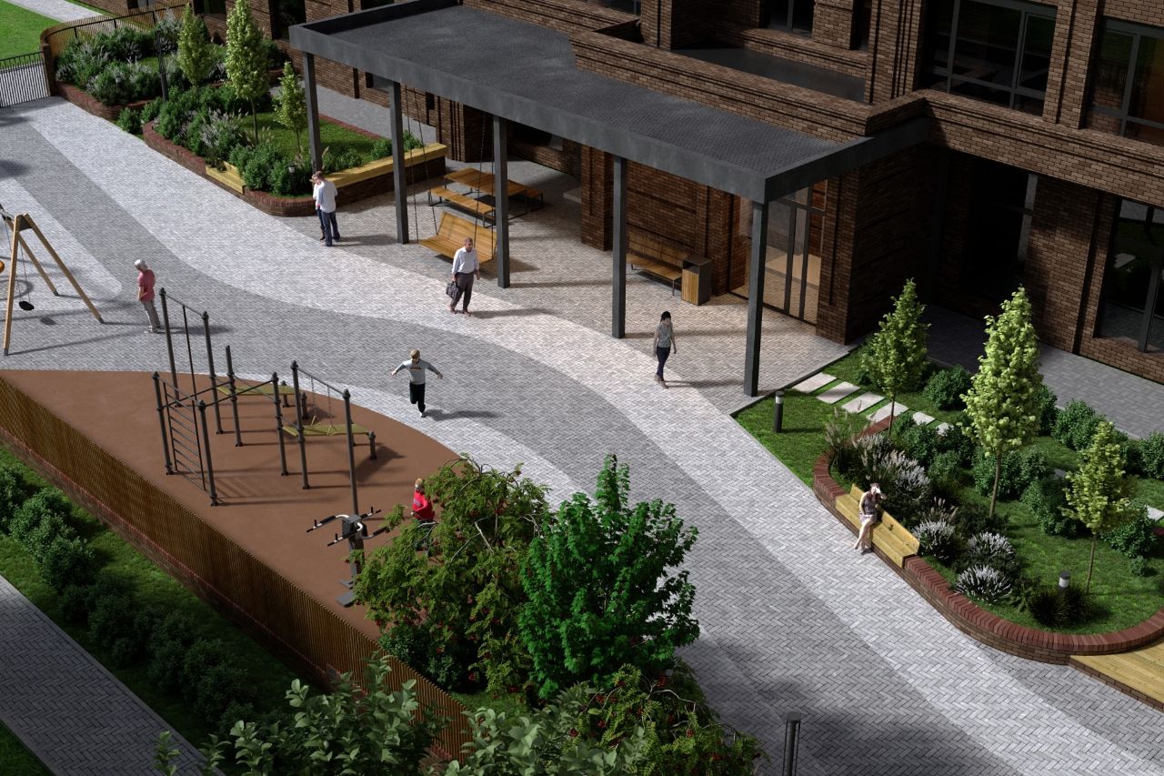 Внутри комплекса вас ждет закрытый приватный двор без машин: дети смогут безопасно играть на современной площадке, а взрослые — отдыхать в тени деревьев, наслаждаясь тишиной на удобных скамейках и в стильных беседках.